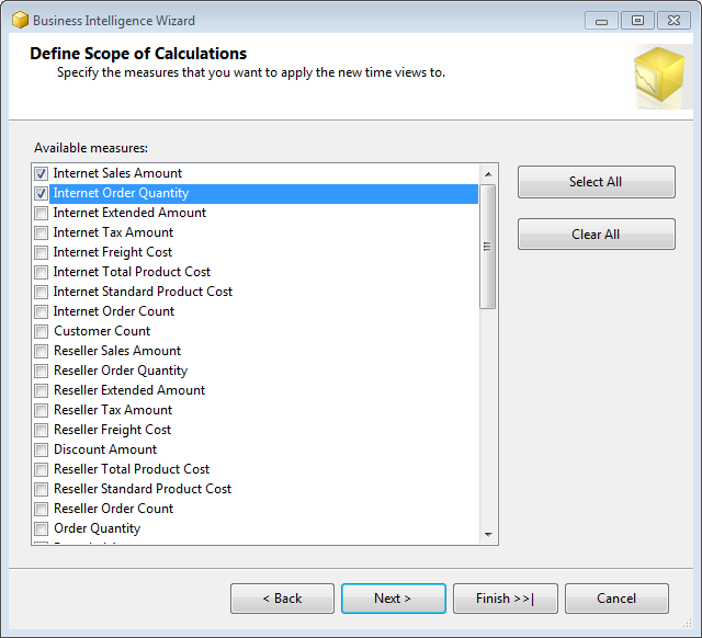• Sélectionner les mesures sur lesquelles vous voulez appliquer ses analyses. Dans l’exemple, je choisis « Internet Sales Amount » et « Internet Order Quantity », puis cliquer sur « Finish », puis encore sur « Finish » dans la fenêtre d’après.