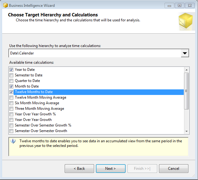 Votre dimension doit être définie comme une dimension date en spécifiant bien les niveaux (plus il y a de niveaux définis, plus le choix de mesures à rajouter est grand)
