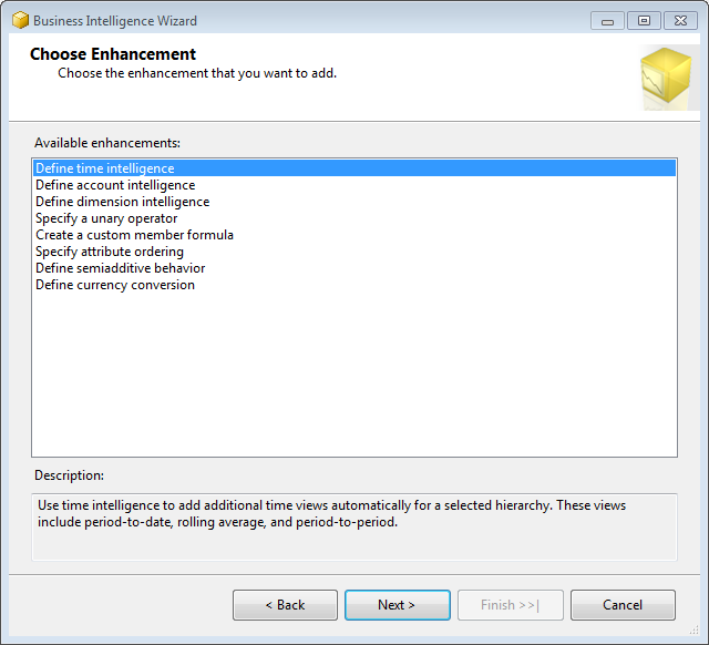 • Dans la fenêtre qui s’ouvre, cliquer sur « Next », puis sélectionner « Define Time Intelligence » et cliquer sur « Next »