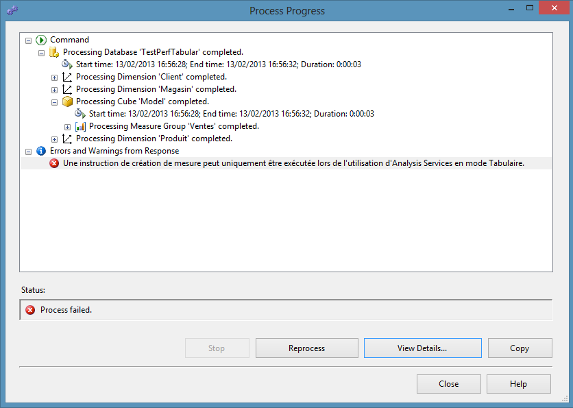 On va commenter les lignes propres aux relations de dimensions, et on continue notre expérience Evidemment, on obtient une nouvelle erreur. C’est encore un paramètre propre au tabulaire sur le partage de stockage entre dimension et groupe de mesures. On commente et on continue.
