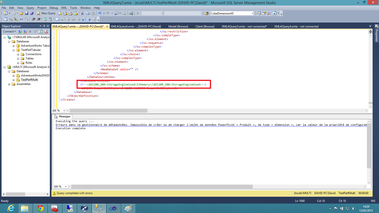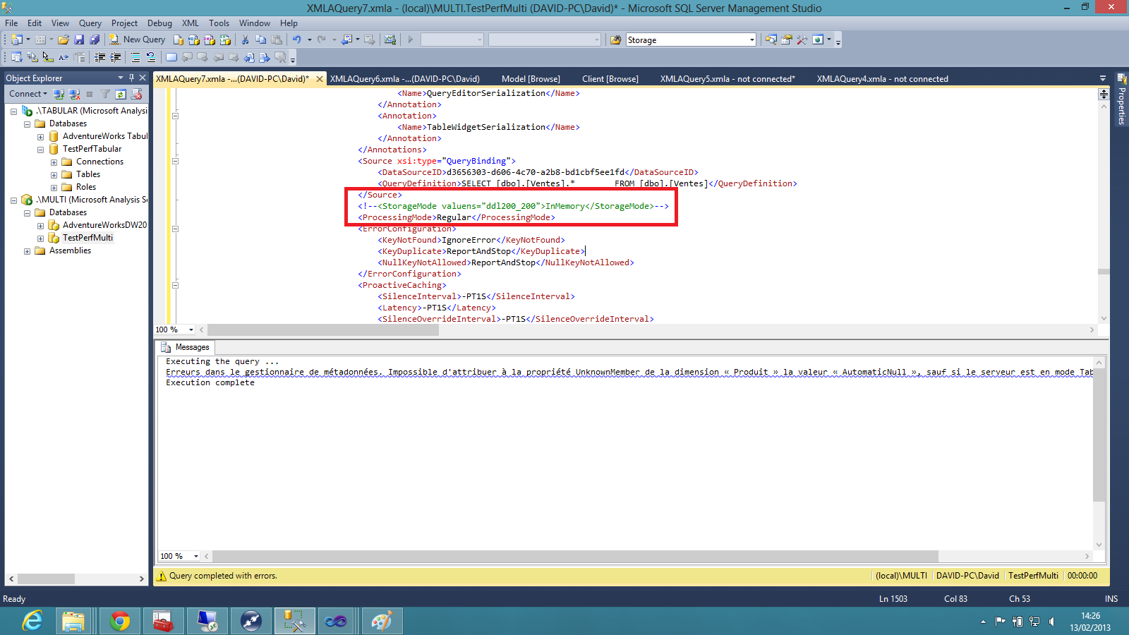 Et c’est ici qu’on va commencer à mettre les mains dans le XMLA (de manière assez superficielle malgré tout). J’ai en effet bon espoir que cette erreur ne soit due qu’au choix de la valeur InMemory pour le paramètre StorageEngineUsed dans le noeud Database.