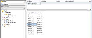 Première constatation, j’ai un datasource view fonctionnel sans relation, j’ai des dimensions pour toutes mes tables (il a même gardé la hiérarchie que j’avais créée sur ma dimension Client) et j’ai un cube avec un groupe de mesures également pour toutes les tables (Si on examine le XMLA en tabulaire, on constate bien qu’il crée une dimension et un groupe de mesures par table)